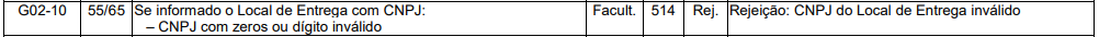 Essa rejeição ocorre quando o CNPJ do Local de Entrega é inválido.