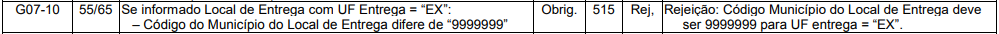 Essa rejeição ocorre quando o Código Município do Local de Entrega difere de 9999999 para UF entrega = EX.