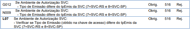Essa rejeição ocorre quando o tpEmis informado é incompatível com SVC-[SP/RS].