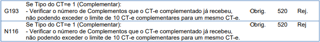 Rejeição 520: CT-e não pode receber mais do que 10 CT-e Complementares (CT-e)