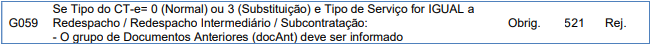 Rejeição 521: Os documentos de transporte anterior devem ser informados para os tipos de serviço Subcontratação, Redespacho e Redespacho Intermediário (CT-e)