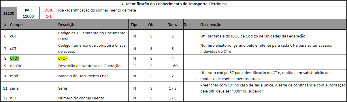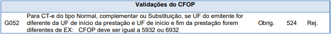 Se informado CFOP (Campo: CFOP) diferente destes valores, o CT-e será rejeitado.