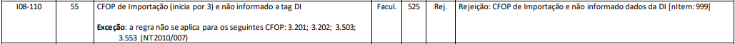 Essa rejeição ocorre quando o CFOP de Importação e não foi informado dados da DI.