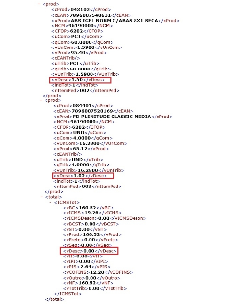 O cálculo do Total de Desconto da NF-e/ NFC-e é feito a partir do somatório do valor de Desconto de cada item: