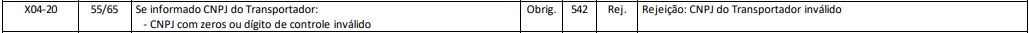 Essa rejeição ocorre quando o CNPJ do Transportador é inválido.