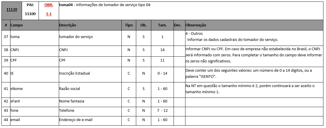 Para clientes que emitem o arquivo em TXT o campo toma04 é referente a linha 11120 e o campo CNPJ/ CPF é referente a 2º linha, conforme podemos visualizar abaixo nos manuais da NDD.
