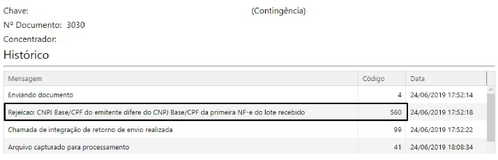 Ao se deparar com a Rejeição (560): “CNPJ base do emitente difere do CNPJ base da primeira NF-e do lote recebido”, significa que foi gerado um lote de notas para a SEFAZ, das quais uma delas contém um CNPJ do emitente diferente da primeira nota do lote. Ou seja, o lote deve conter somente notas do mesmo CNPJ emitente.
