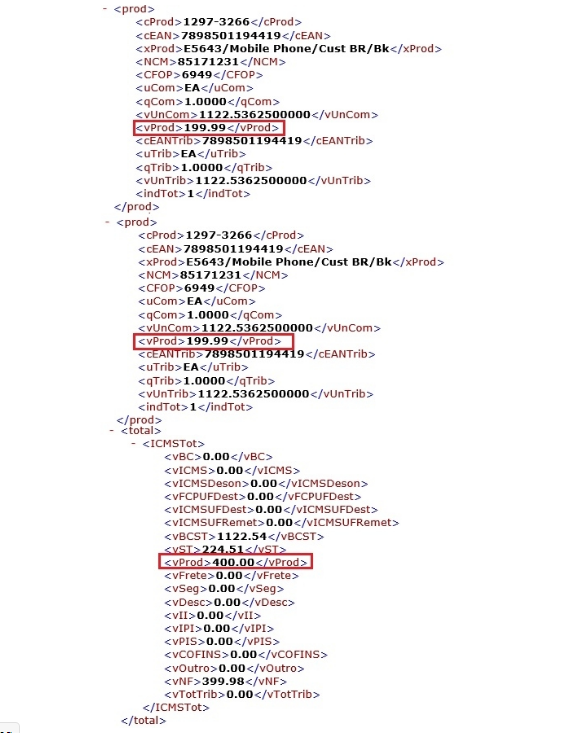 Como o somatório correto dos campos (vProd) é R$ 399,98 reais, a NF-e será rejeitada.