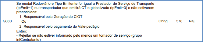 Verificar quando o modal Rodoviário e tipo Emitente for igual a Prestador de Serviço de Transporte (tpEmit=1) ou transportador que emitirá CT-e globalizado (tpEmit=3) e não estiverem preenchidos:
