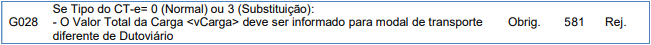 Rejeição 581: Campo Valor da Carga deve ser informado para o modal (CT-e)