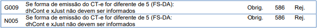 Verificar se forma de emissão do CT-e for diferente de 5 (FS-DA): dhCont e xJust não devem ser informados.