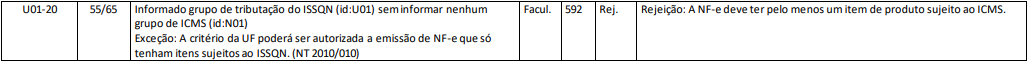 Essa rejeição ocorre quando a NF-e não contém pelo menos um item de produto sujeito ao ICMS.