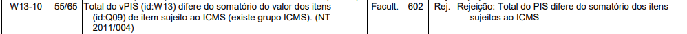 Rejeição 602: Total do PIS difere do somatório dos itens sujeitos ao ICMS (NF-e)