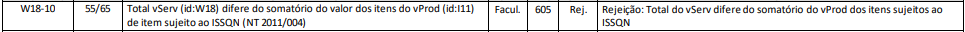Essa rejeição ocorre quando o Total do vISS difere do somatório do vProd dos itens sujeitos ao ISSQN.
