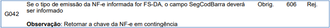 Essa rejeição ocorre quando o Segundo Código de Barras deve ser informado para NF-e em contingência (FS-DA e FS-IA).