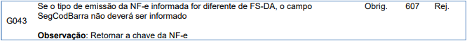 Verificar se o tipo de emissão da NF-e informada for diferente de FS-DA, o campo SegCodBarra não deverá ser informado.