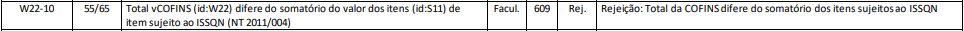 Essa rejeição ocorre quando o Total do COFINS difere do somatório dos itens sujeitos ao ISSQN.