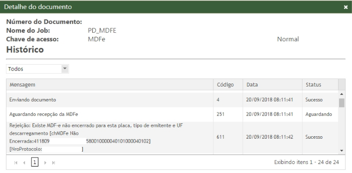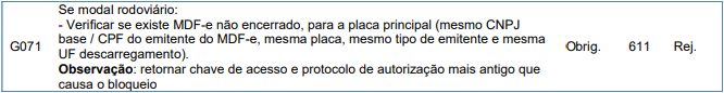 Além da mensagem de rejeição, a Sefaz retorna a chave de acesso e protocolo de autorização do MDF-e mais antigo que causa o bloqueio.