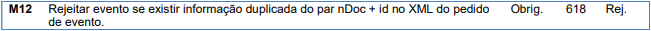 Verificar pois irá rejeitar evento se existir informação duplicada do par nDoc + id no XML do pedido de evento.
