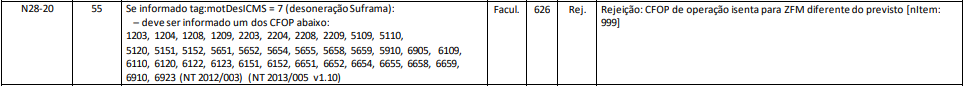 Essa rejeição ocorre quando o CFOP de operação isenta para ZFM é diferente do previsto.