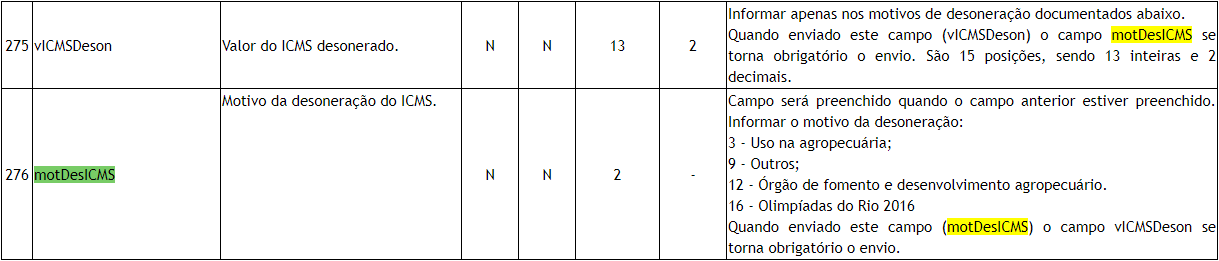 Quando for emitido uma NF-e e for informado o campo motDesICMS, o campo vICMSDeson deve ser maior que zero, senão retornará à rejeição.