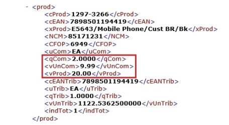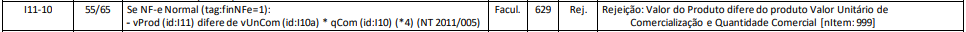 Com erro (superior a R$ 0,01) no Valor do Produto (Campo: det / prod / vProd) originado da multiplicação entre o Valor Unitário de Comercialização (Campo: det / prod / vUnCom) e a Quantidade Comercial (Campo: det / prod / qCom), vUnCom x qCom = vProd