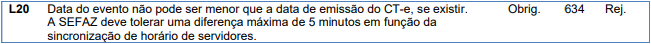Rejeição 634: A data do evento não pode ser menor que a data de emissão do CT-e (CT-e)