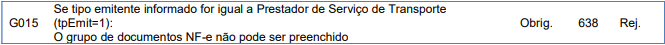 Essa rejeição ocorre quando informada Nota Fiscal para tipo de emitente Prestador Serviço de Transporte.
