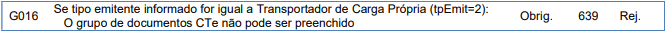 Essa rejeição ocorre quando informado Conhecimento de Transporte Eletrônico para tipo de emitente Transporte de Carga Própria.