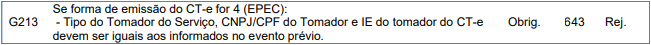 Rejeição 643: As informações do tomador de serviço do CT-e devem ser iguais as informadas no EPEC (CT-e)