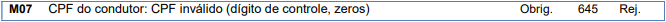 Verificar o CPF do condutor pois o CPF está inválido (dígito de controle, zeros).