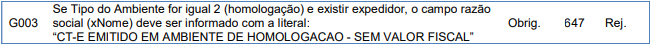 Rejeição 647: CT-e emitido em ambiente de homologação com Razão Social do expedidor diferente de CT-E EMITIDO EM AMBIENTE DE HOMOLOGACAO - SEM VALOR FISCAL (CT-e)