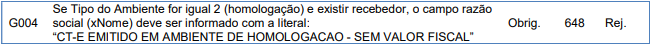 Rejeição 648: CT-e emitido em ambiente de homologação com Razão Social do recebedor diferente de CT-E EMITIDO EM AMBIENTE DE HOMOLOGACAO - SEM VALOR FISCAL (CT-e)