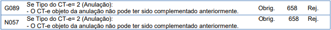 Rejeição 658: CT-e objeto da anulação não pode ter sido complementado (CT-e)