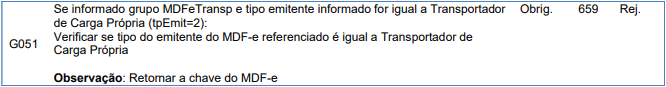 Essa rejeição ocorre quando o Tipo do Emitente do MDF-e referenciado difere do Transportador de Carga Própria.