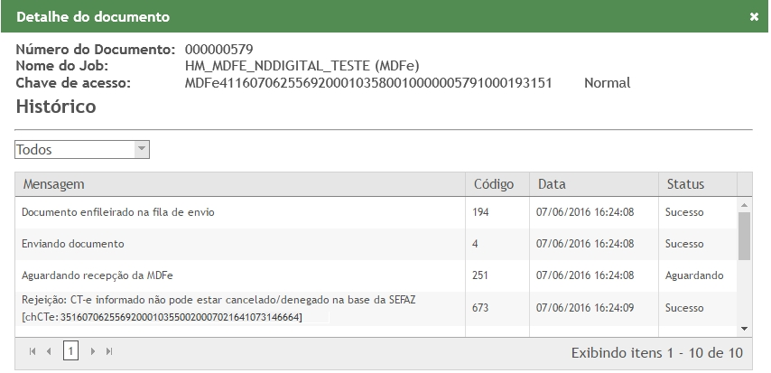 Quando for emitido um MDF-e e for vinculado um CT-e e neste for informado uma chave que está denegada ou cancelada na Sefaz, será retornado uma rejeição.
