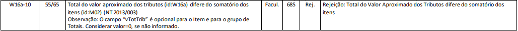 Deve-se verificar se o Total do valor aproximado dos tributos (id:W16a) difere do somatório dos itens (id:M02) (NT 2013/003).