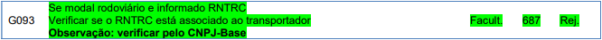 Essa rejeição ocorre quando o RNTRC deve estar associado ao transportador indicado.