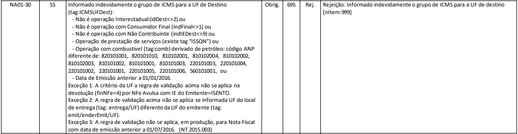 Quando for emitida uma NF-e com pelo menos uma das situações abaixo e for informado o Grupo de ICMS para a UF de Destino (ICMSUFDest), será retornado à rejeição:
