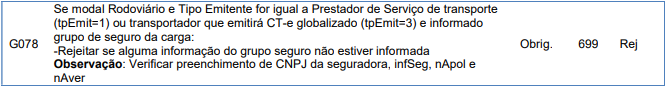 Essa rejeição ocorre quando os Dados do seguro de carga estão incompletos para o modal rodoviário.
