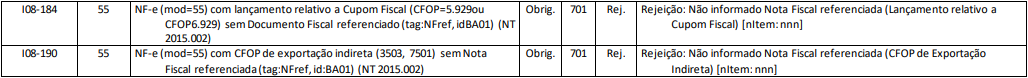 Ou quando for emitida uma NF-e com CFOP de exportação indireta (3503, 7501) sem Nota Fiscal referenciada (tag: NFref), então retornará a rejeição.