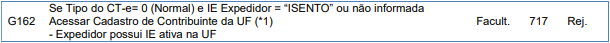 Verifique durante a emissão deste CT-e (CT-e = 0 normal) e a IE do expedidor for informada = “ISENTO” ou não for informada, mas o expedidor possui IE ativa na UF.