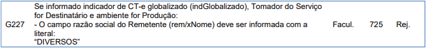 Rejeição 725: Razão Social do Remetente do CT-e Globalizado inválido (CT-e)
