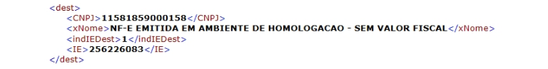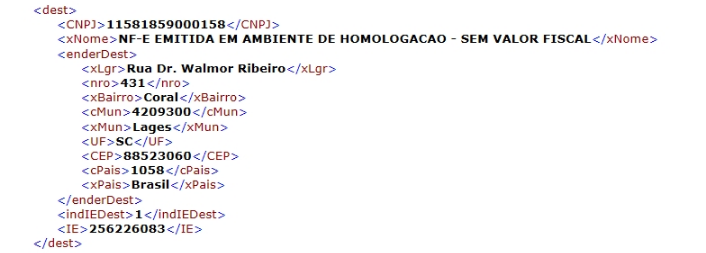 O exemplo a seguir mostra trecho de XML sem as informações do endereço do destinatário (enderDest):
