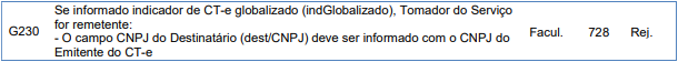 Rejeição 728: CNPJ do destinatário do CT-e Globalizado deve ser o mesmo do emitente do CT-e (CT-e)