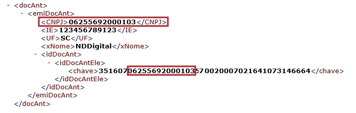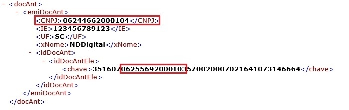 O CNPJ informado no campo (emiDocAnt/CNPJ) deve ser igual o CNPJ da chave informada, informada dentro da tag (idDocAntEle).