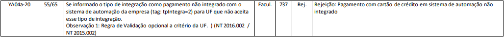 Rejeição 737: Pagamento com cartão de crédito em sistema de automação não integrado (NF-e)