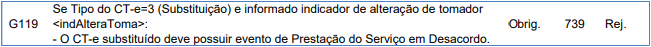 Essa rejeição ocorre ao emitir um CT-e do tipo 3 (substituição) mas o CT-e substituído não possui evento de Prestação do Serviço em Desacordo para alteração de tomador.