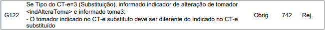 Rejeição 742: Tomador do CT-e substituto igual ao informado no CT-e substituído para operação de alteração de tomador (CT-e)