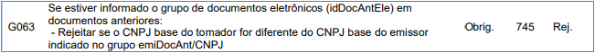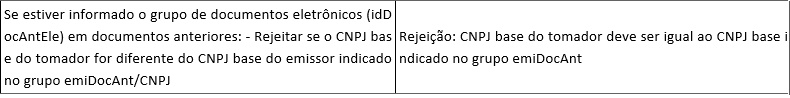 Irá rejeitar se o CNPJ base do tomador for diferente do CNPJ base do emissor indicado no grupo emiDocAnt/CNPJ.